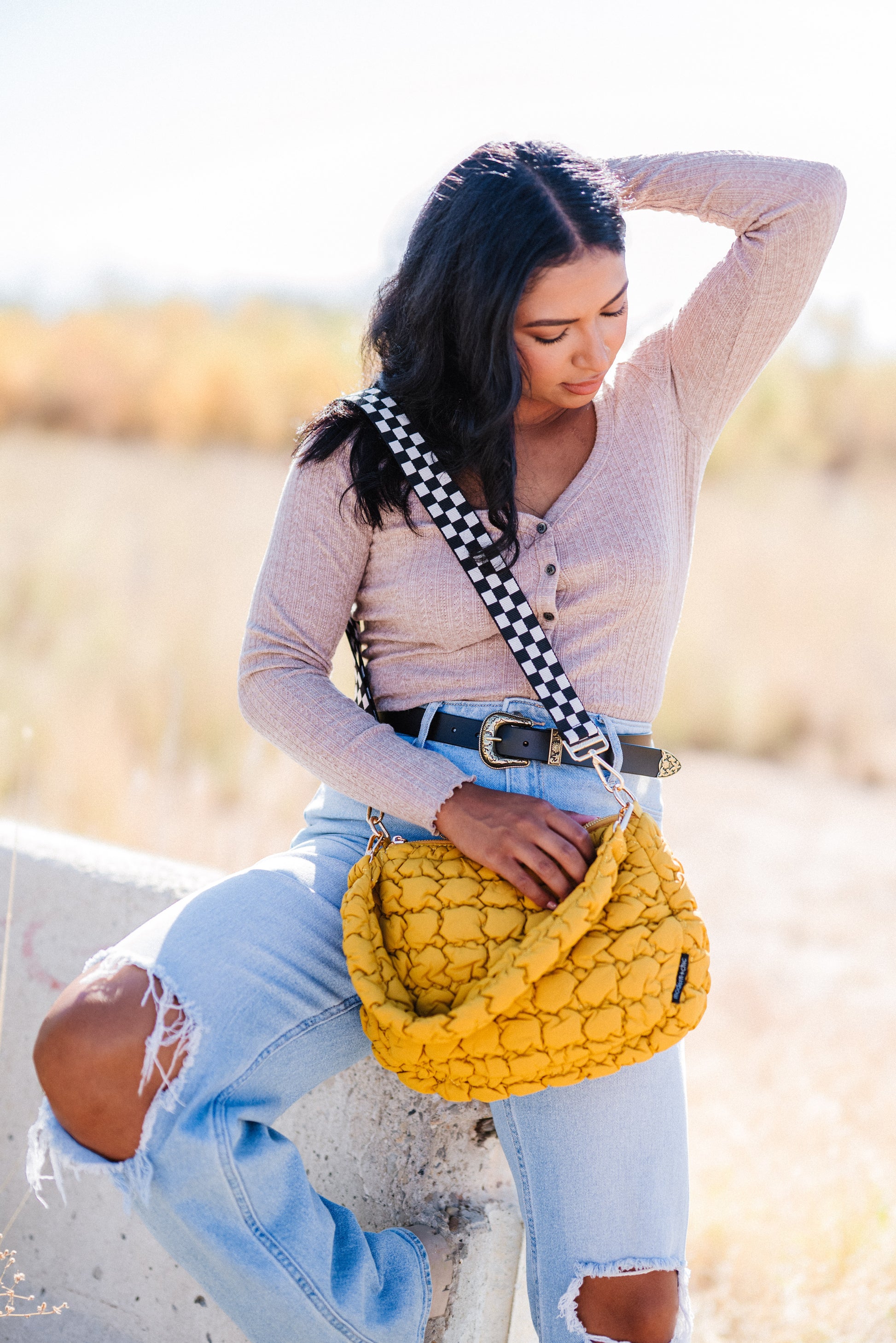 Big Yellow Taxi features the Alyssa in Mustard and the Lizzie Strap in Black. The strap adjusts from 25" to 50" end to end.