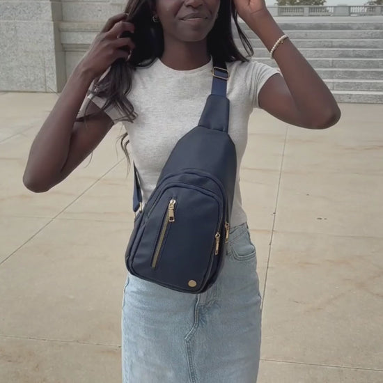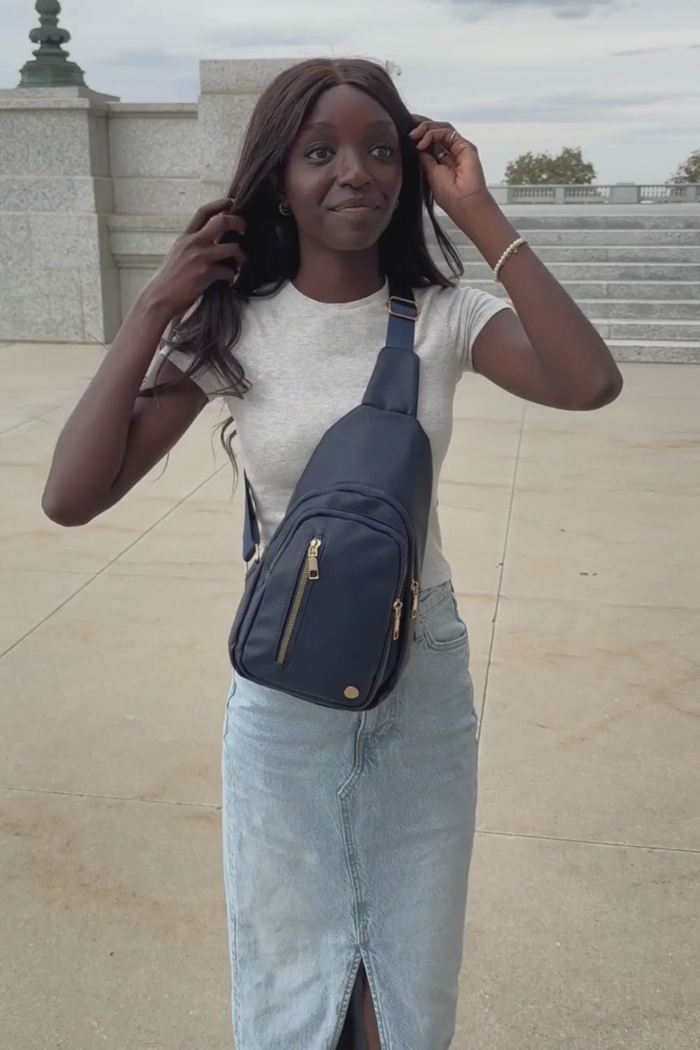 This silky-soft vegan leather sling bag fits everything you need while you're on the go, without appearing bulky. The front pocket fits most phones for easy access, while the other pockets are ideal for keys, your wallet, and other small trinkets. This minimalistic crossbody bag is complete with gold hardware and an m+c logo in the bottom right corner.