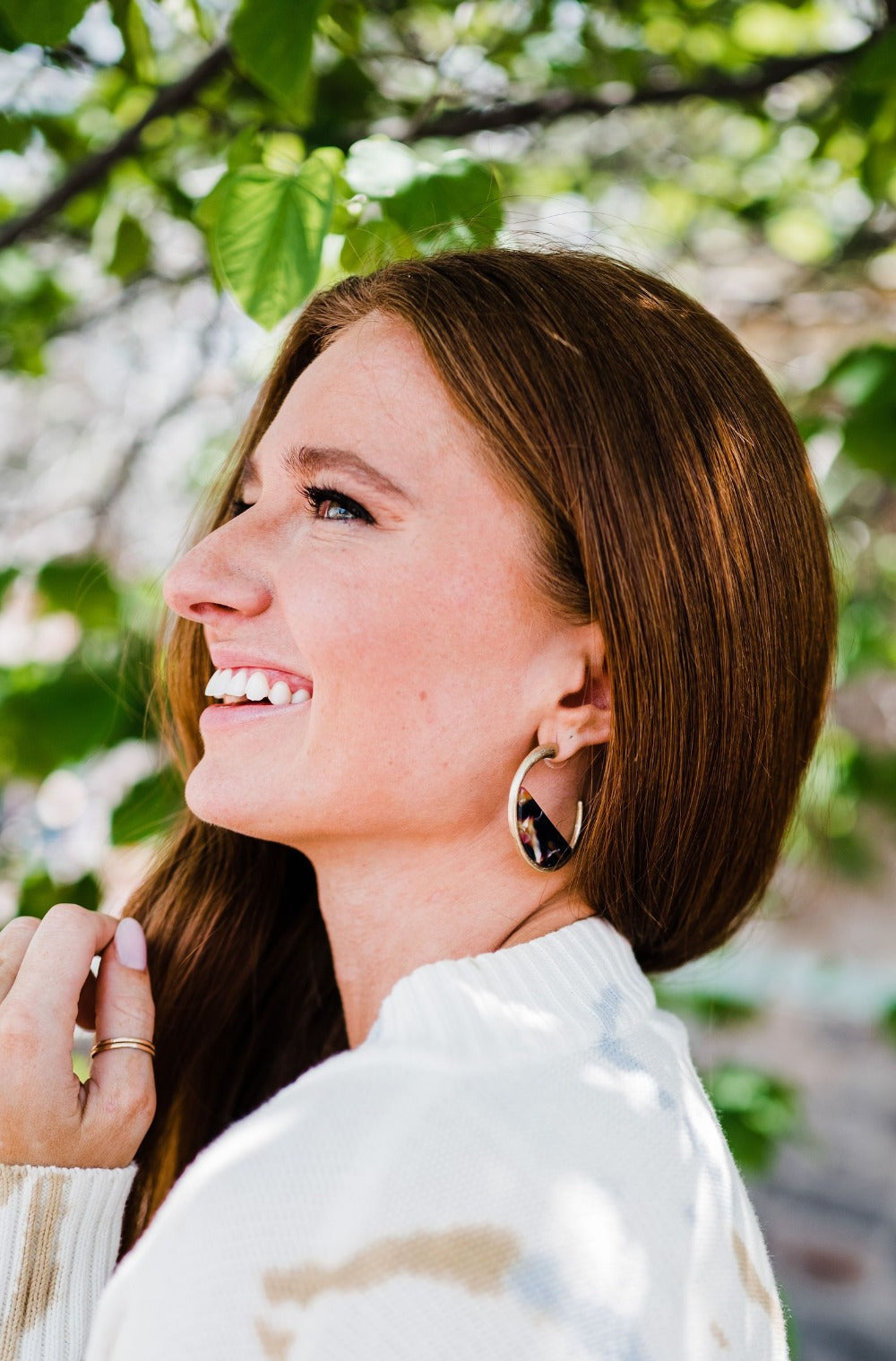 the cora hoops are a dream for fans of timeless styles and trendy earrings alike. we can’t get over how seamlessly the cora hoops blend a playful, colorful pattern with a classic hoop shape!