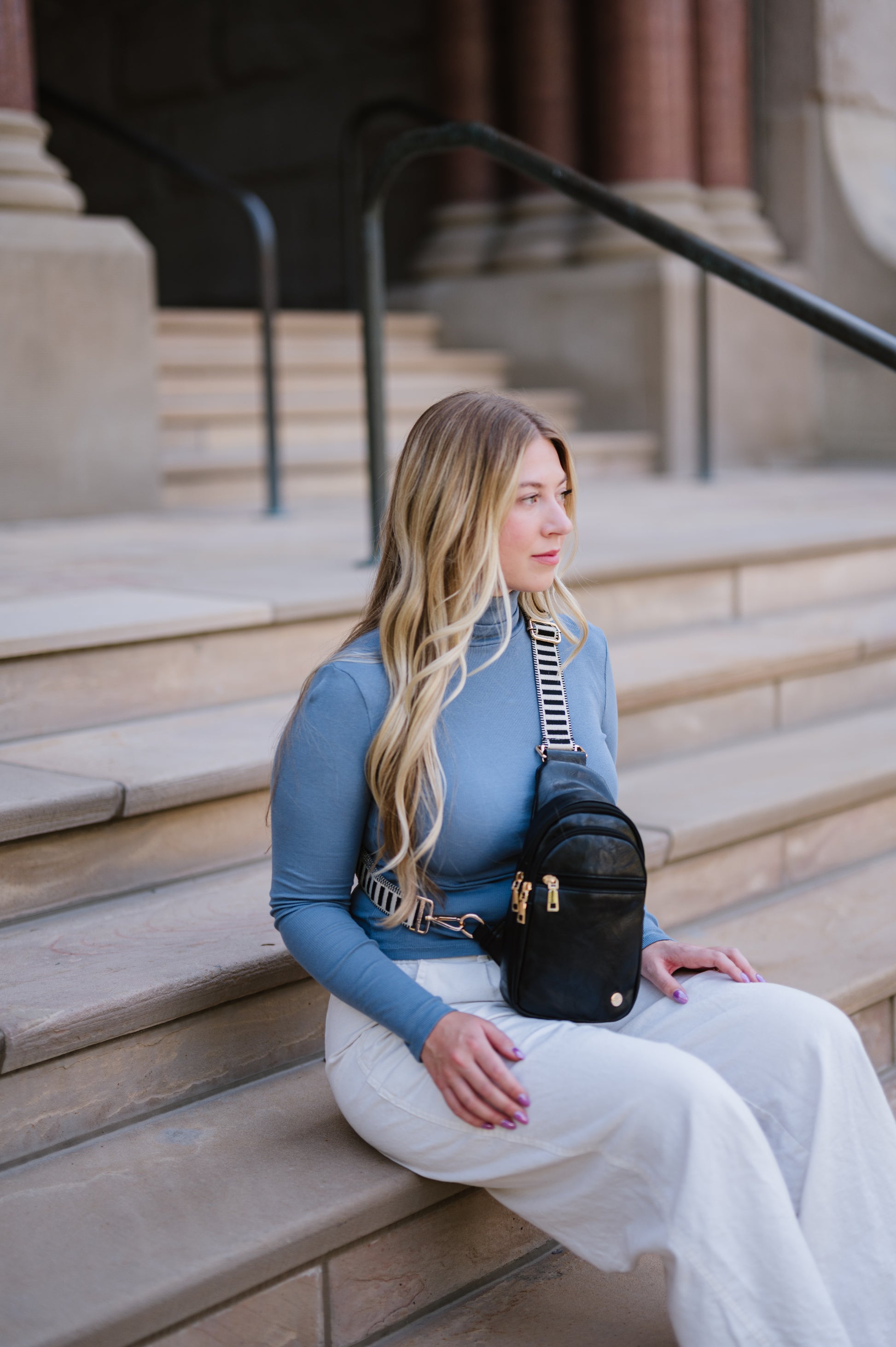 Transform your bag with the Ebony and Ivory Adjustable Strap! With its exceptionally soft material, piano key-inspired design and subtle sparkle, this neutral strap adds a touch of excitement to any look. Elevate your style and make a statement with this new patterned strap.