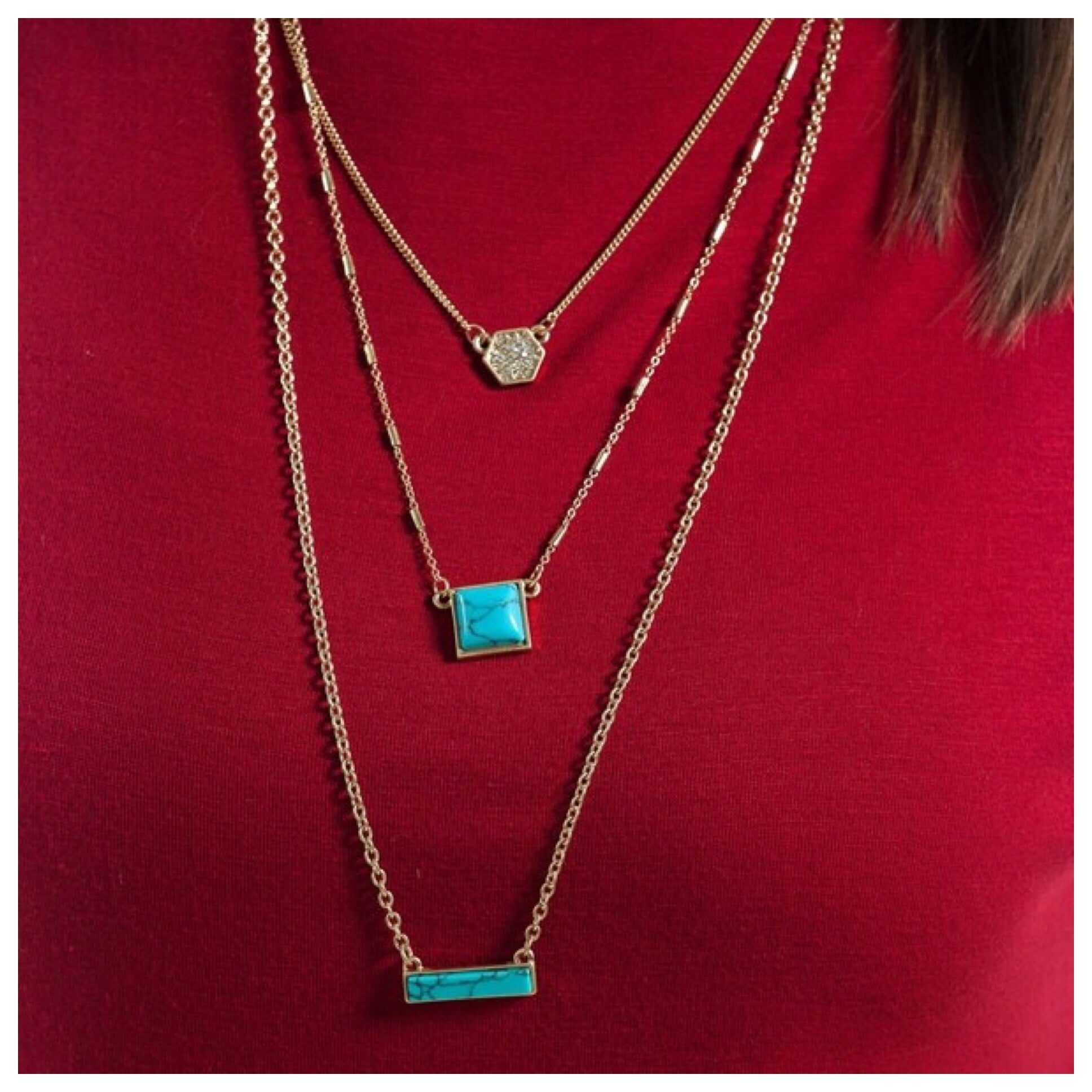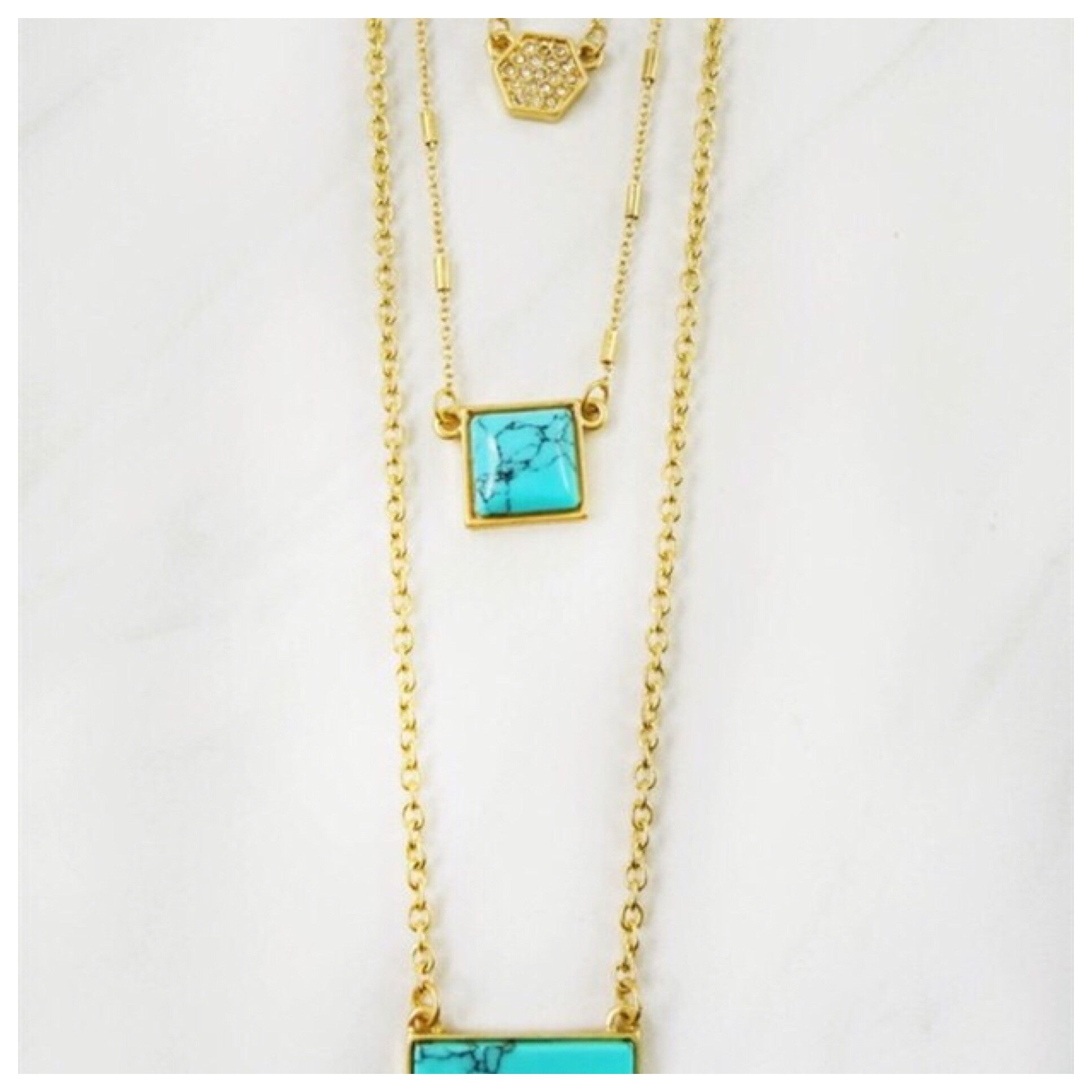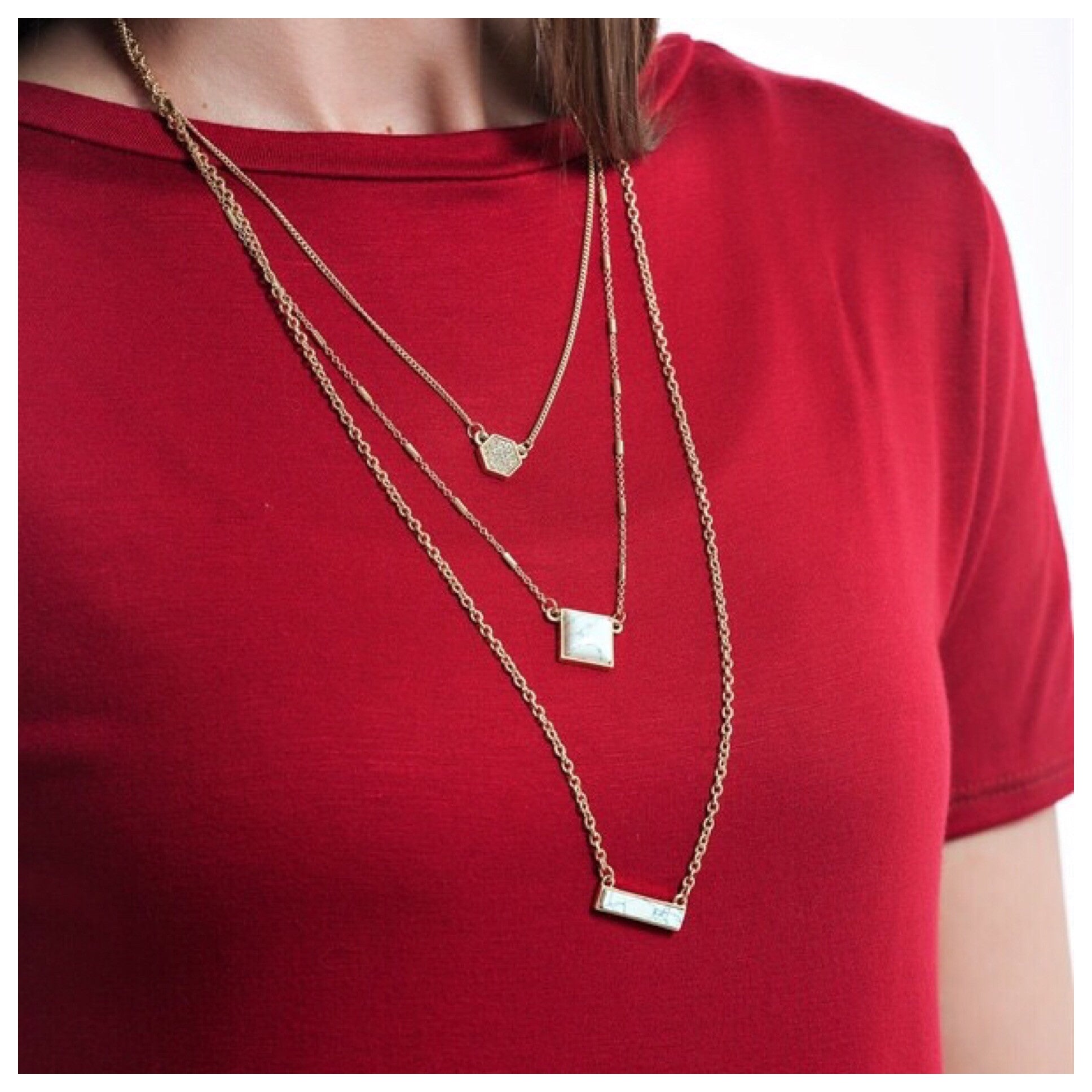 Dainty Chain Necklace come with 3 unique layers. Marble Stone Pendant featured in a square and bar shape as well as a pave hexagon pendant.