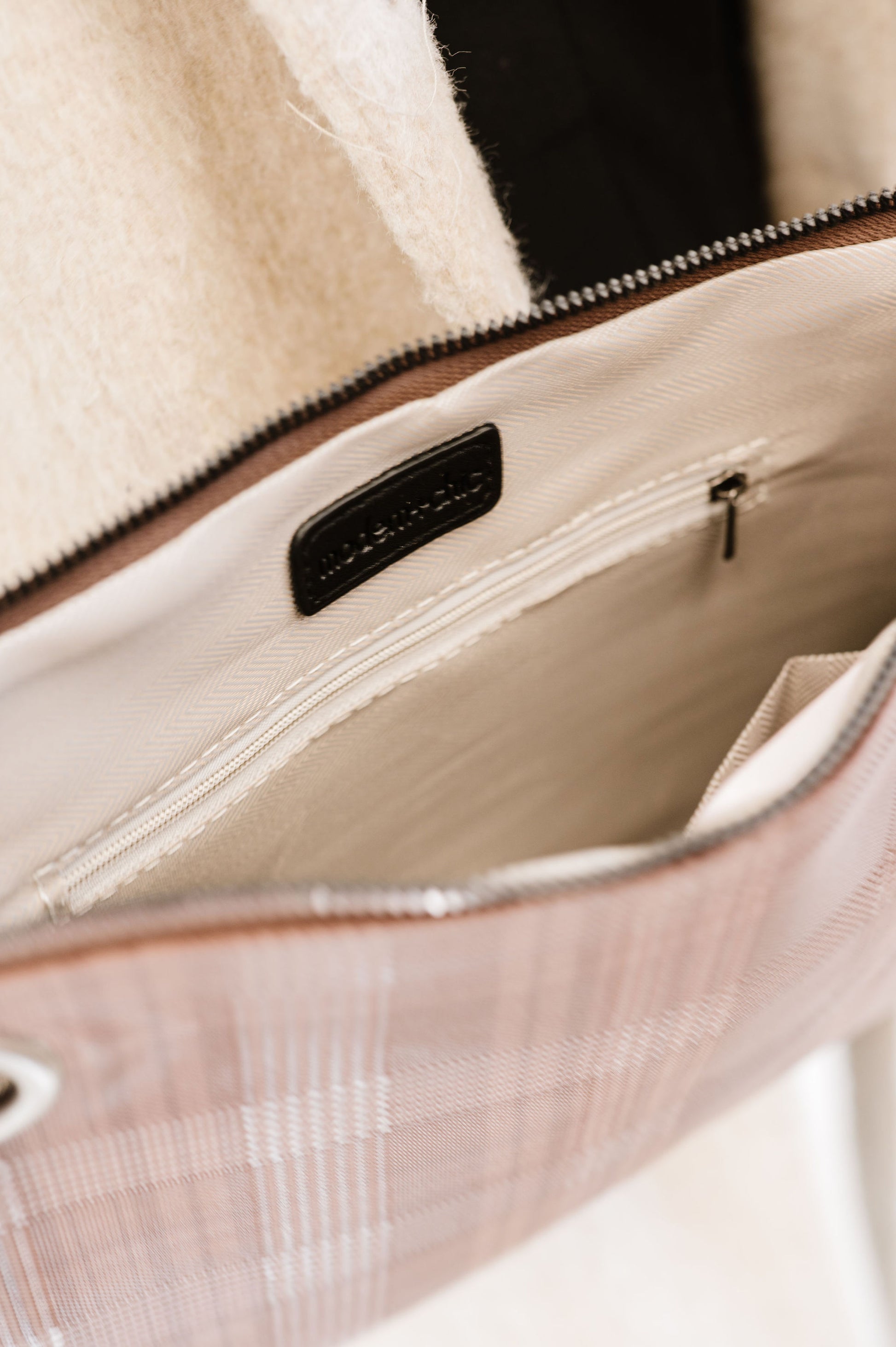 This plaid-patterned beauty is made from durable vegan leather and complemented with dark silver hardware. Inside, you'll find three interior pockets for added organization.