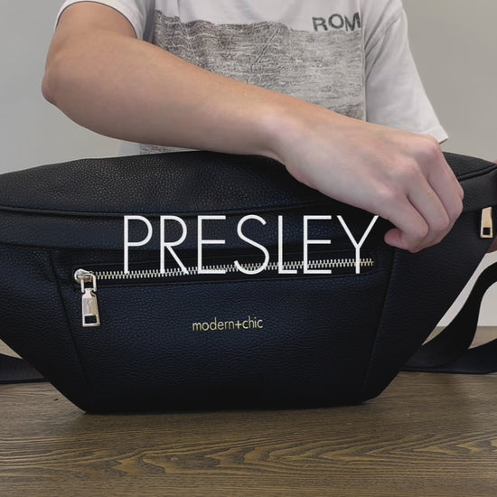 A true essential, the Presley is everything you need in a purse. Complete with gold hardware and pebbled vegan leather, the Presley is guaranteed to become your new everyday bag. It's an oversized belt bag, and it's the perfect size to stuff all your essentials, such as a kindle, wallet, hairbrush, phone, and so much more!
