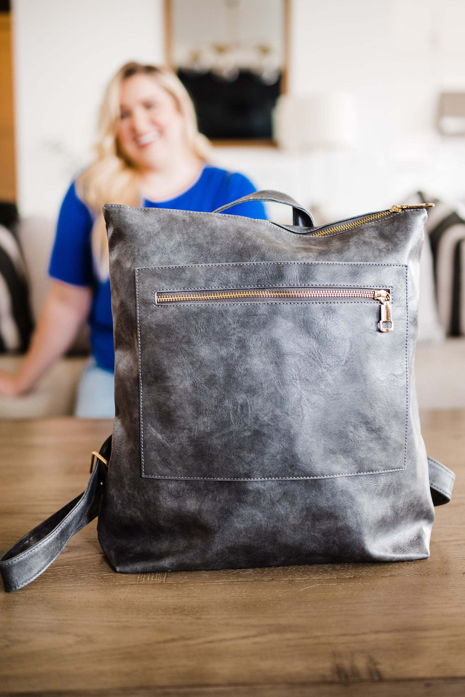 The Reese features adjustable backpack straps and a top handle for a quick grab. It has two exterior pockets (one front and one back) and three interior pockets.
