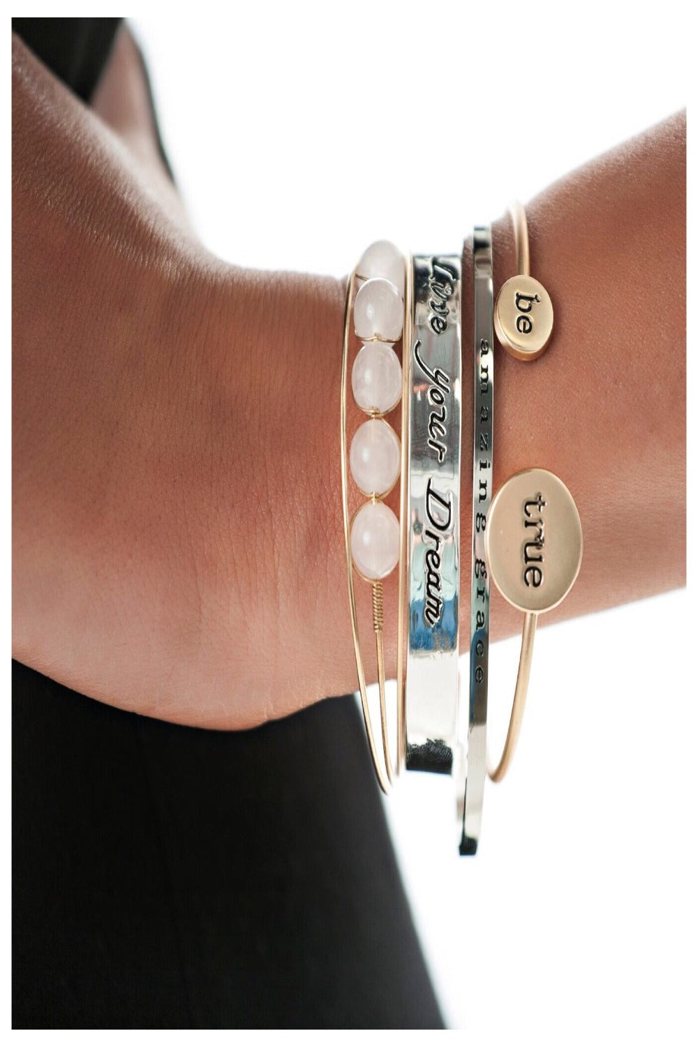Made from Stainless steel these are pieces that will last and will be a lasting reminder to you. Each is stamped with an inspiring phrase to be a happy and helpful reminder.