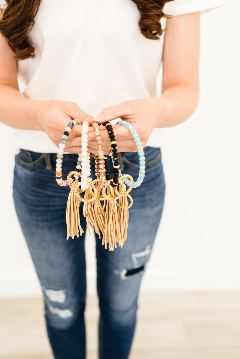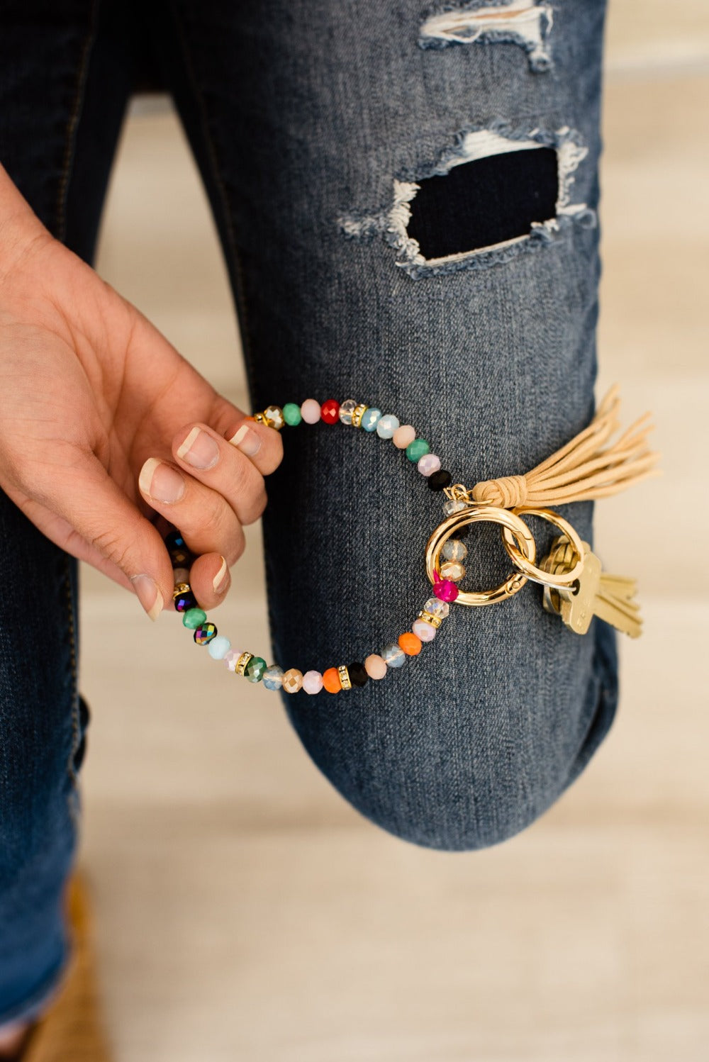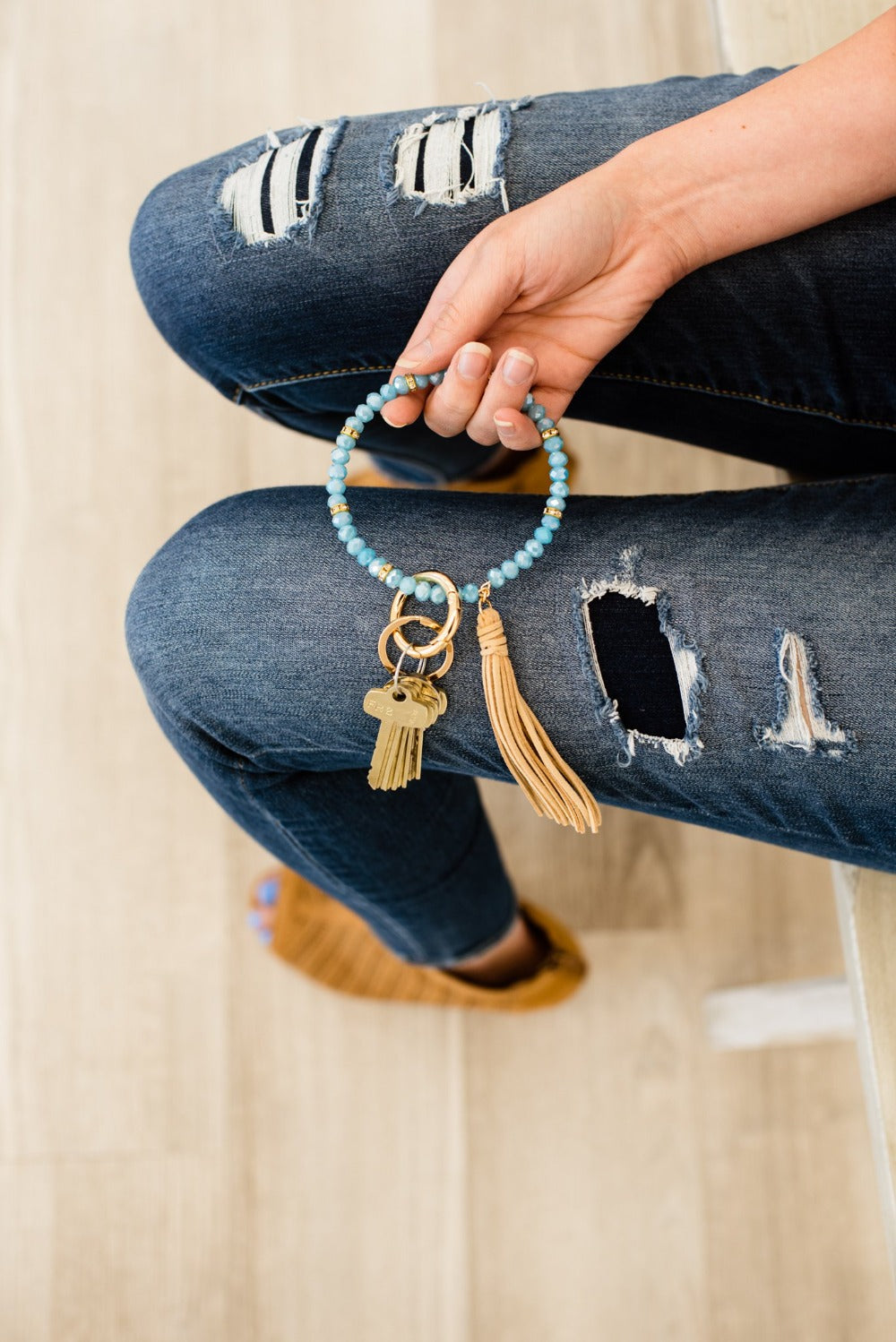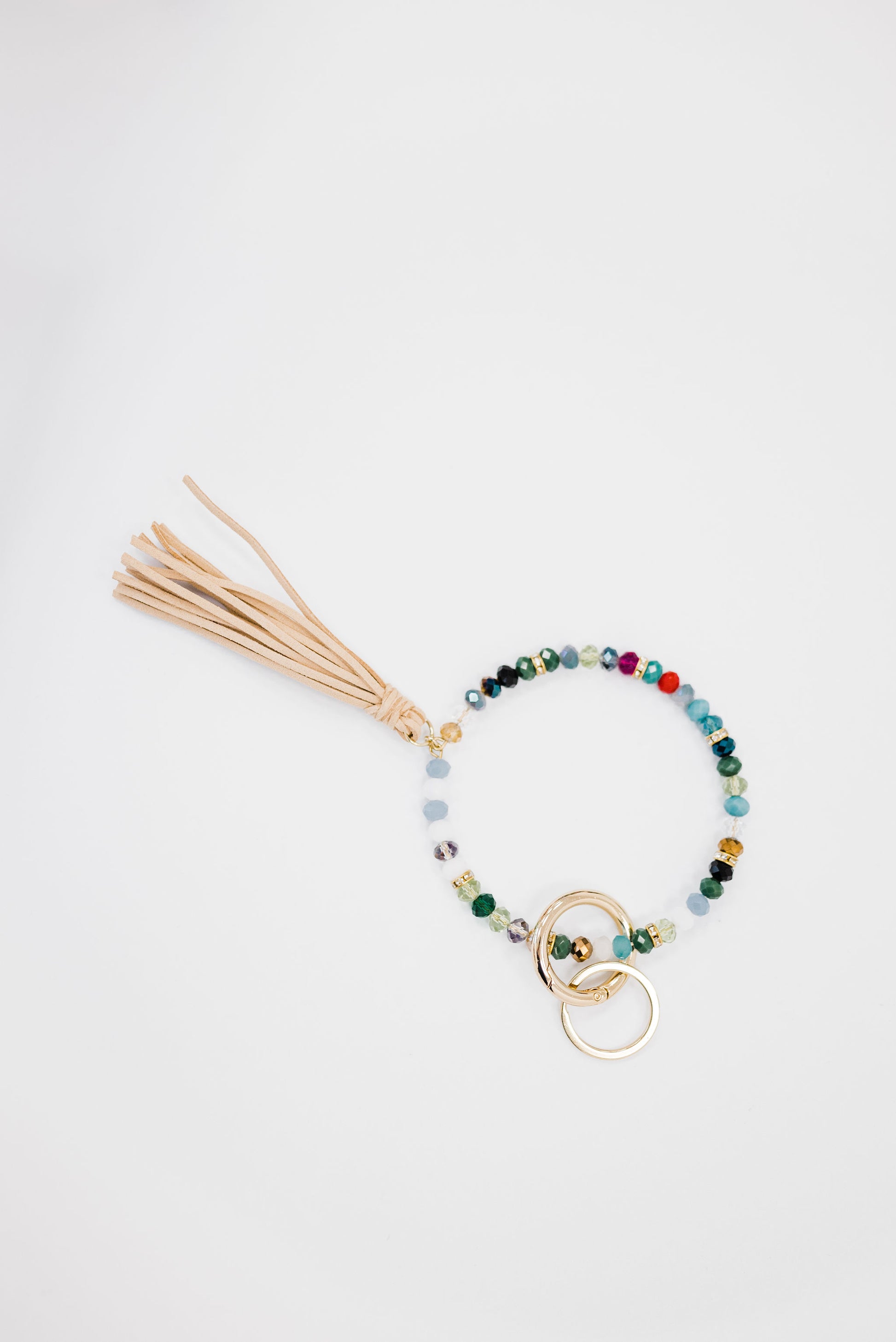 The Zoey Keychain Bracelet was made to keep your hands free while on the go (and make it nearly impossible to misplace your keys again!). The ring easily slips on your wrist and slides up your arm if needed. A suede tassel ties this wristlet keychain together.